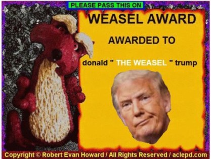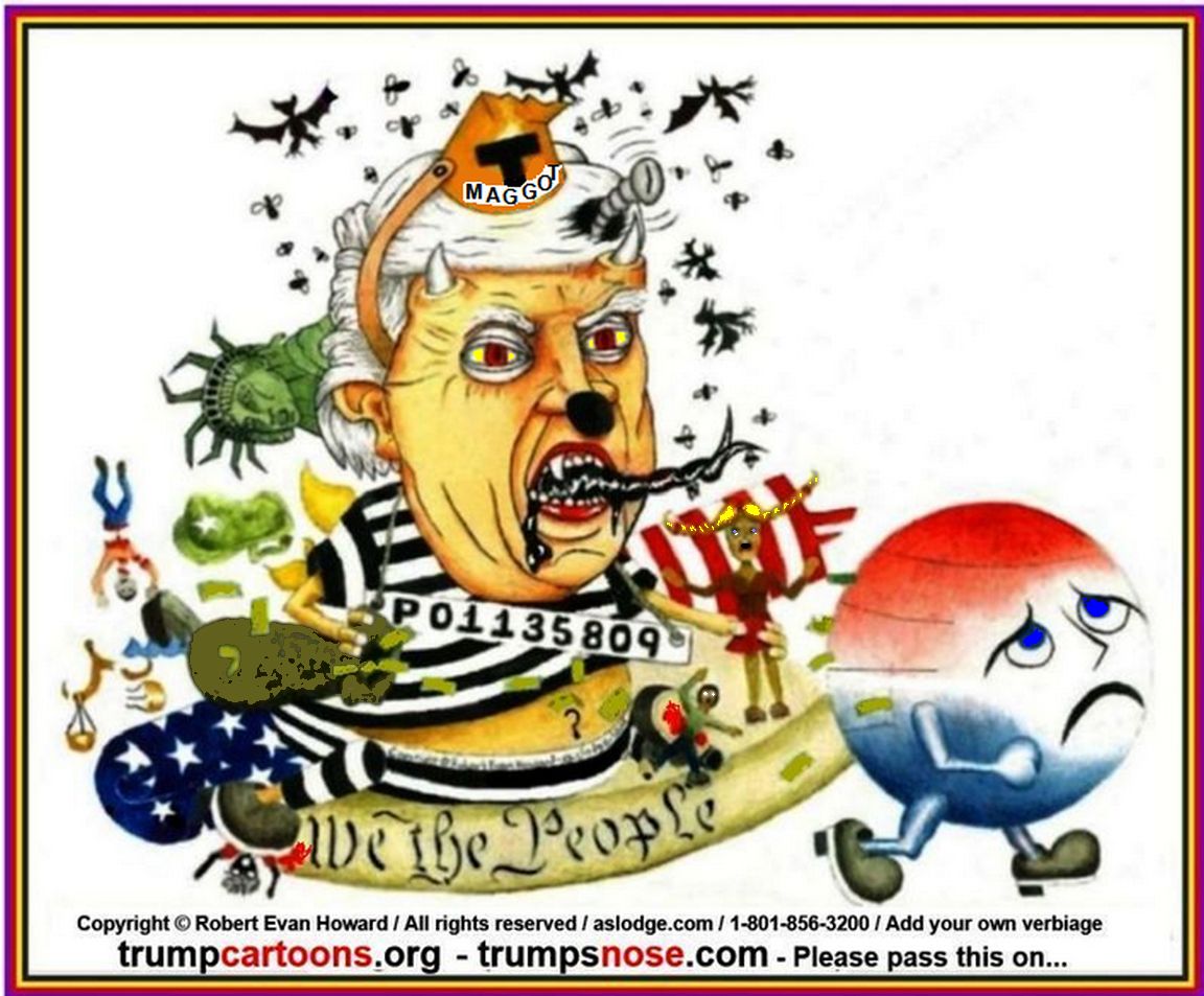 COPPER FOIL CROWN = THE ONLY CROWN HE WILL EVER HAVE. "T" =TRUMP. BATS IN THE BELFRY = LOONY TOONS. HOLE IN THE HEAD = CRAZY. LOOSE SCREW = METNALLY ILL. HORNS = ANTICHRIST. FLYS = DO TO CRAP FOR BRAINS. HORNS = ANTICHRIST. SNAKE EYES = PART OF HIS SLEZZY CHARACTER. FIRE = LIAR, LIAR PANTS ON FIRE. TWISTED BLACK TONGUE = HE SPEWS VITRYOL EVERYWHERE. RAT NOSE = LYING RAT. STATUE OF LIBERTY = IMIGRATION STOPPER. STOMPED ON ARMY HELMET = WHAT HE THINKS OF THE MILITARY VAMPIRE TEETH = SMUCKS AS MUCH MONEY AS HE CAN FROM EVERYONE BLOWN UP BOAT = AGAINST THE LAW. BROOKEN SCALES OF JUSTICE = THINKS OF HIMSELF AS ABOVE THE LAW. P01135809 = HIS BOOKING NUMBER. STOMPING ON THE FLAG, CONSTITUTION, AND PEOPLE OF COLOR = HIS RESPECT FOR THE U.S.A. THE BAG IS TO HOLD ALL THE WOLRDS MONEY = HIS GREED. THE YUNG GIRL IN HIS LEFT HAD = THE FEMALE HE HAS SEXUALLY ASSAULTED. THE WHOLE WARLD TRYING ESCAPE HIS INFLUENCE = HIS EXSTREME EGO... |